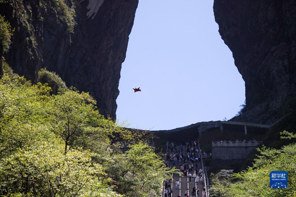 4月30日,张树鹏在空中滑翔准备穿越天门洞。