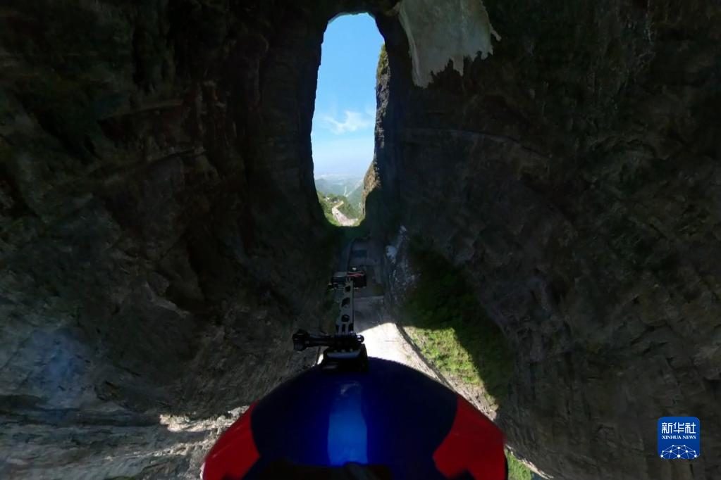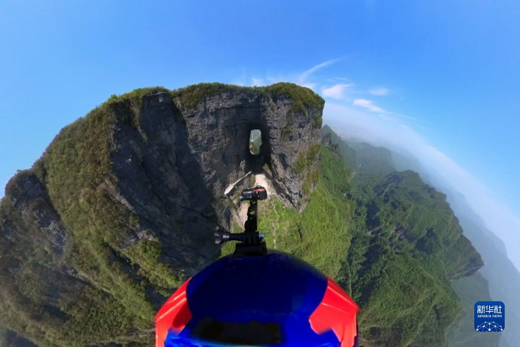 4月30日,张树鹏在空中滑翔穿越天门洞。