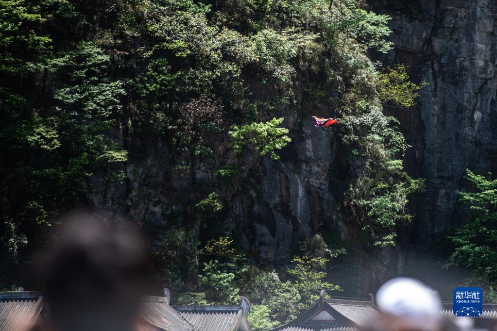 4月30日,张树鹏在空中滑翔即将穿越天门洞。