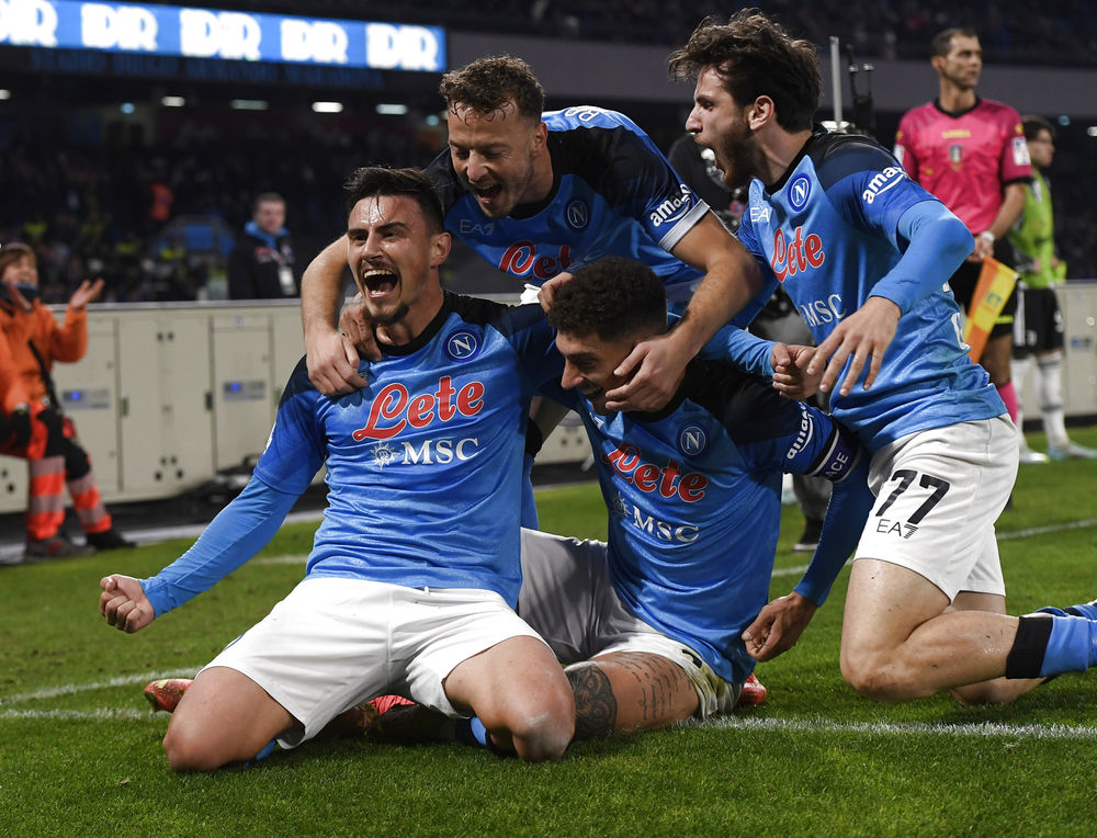 1月13日,那不勒斯队球员埃尔马斯(左一)进球后与队友庆祝。当日,在2022-2023赛季意大利足球甲级联赛第18轮比赛中,那不勒斯队主场以5比1战胜尤文图斯队。新华社发(阿尔贝托·林格利亚摄)