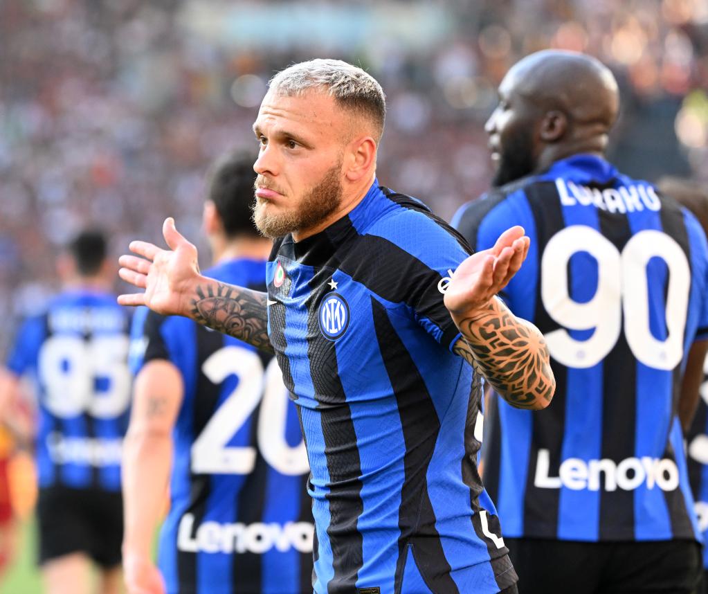 罗马迎战国米是积分榜前四之争的一场关键战,比赛伊始,双方你来我往,第33分钟,一阵猛烈的进攻尝试后,客队国米拔得头筹,邓弗里斯右路带球在禁区边缘送出传中,迪马尔科后点包抄,小角度射门得手。