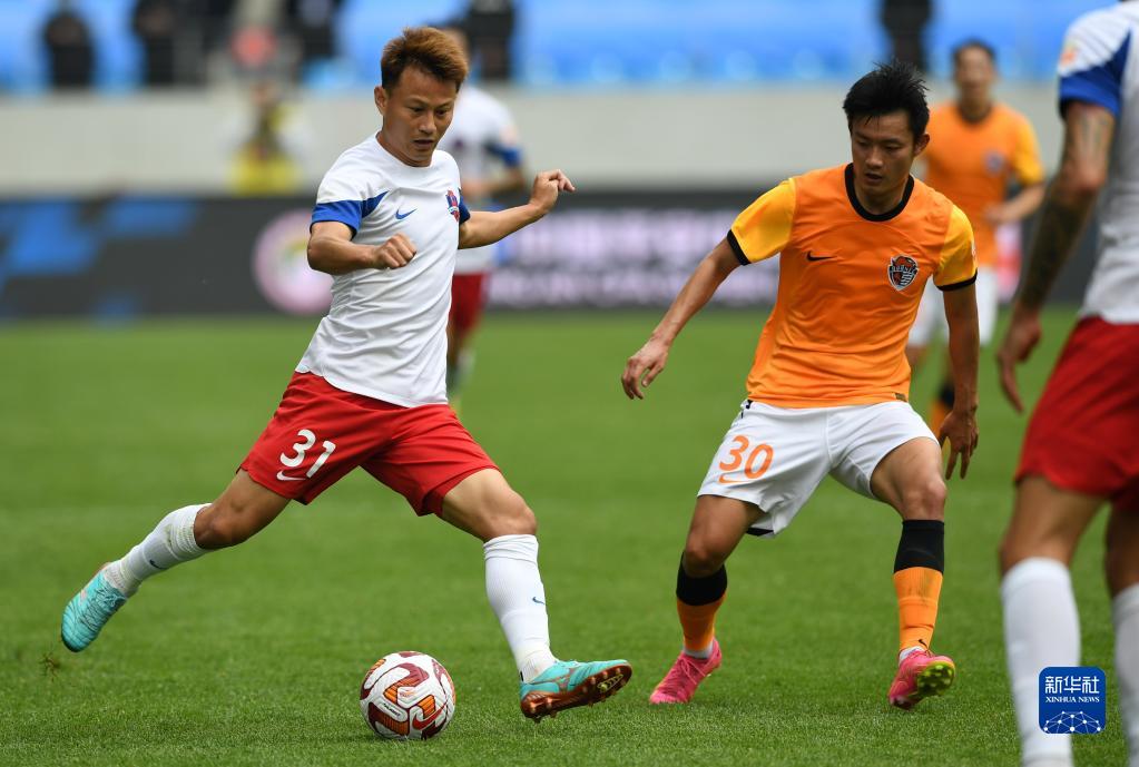 5月14日,梅州客家队球员史亮(右一)在比赛中防守青岛海牛队球员塔贝克进攻。新华社记者 李紫恒 摄