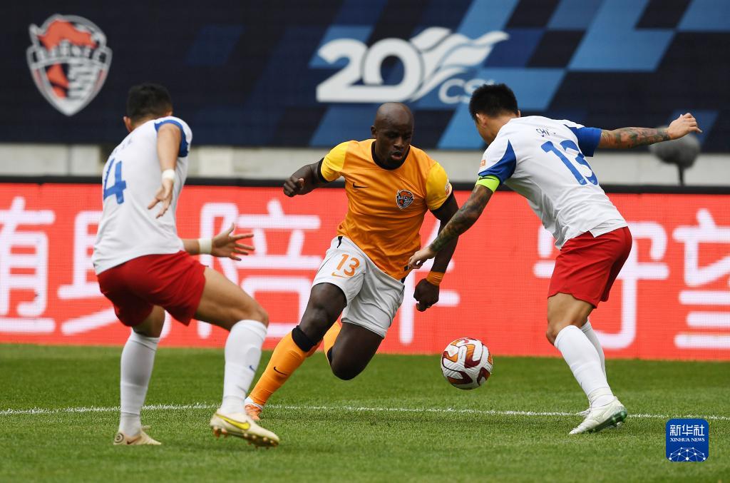 5月14日,青岛海牛队球员钟晋宝(左二)在比赛中带球突破。新华社记者 李紫恒 摄