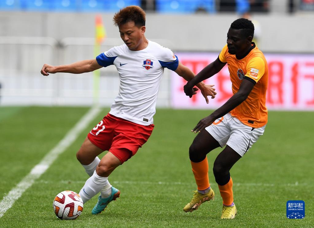 5月14日,梅州客家队球员李永佳(左一)在比赛中防守青岛海牛队球员康瓜的进攻。新华社记者 李紫恒 摄