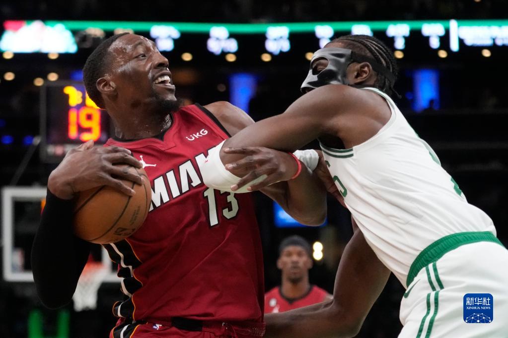 5月17日,热火队球员阿德巴约(左)与凯尔特人队球员布朗拼抢。新华社/美联