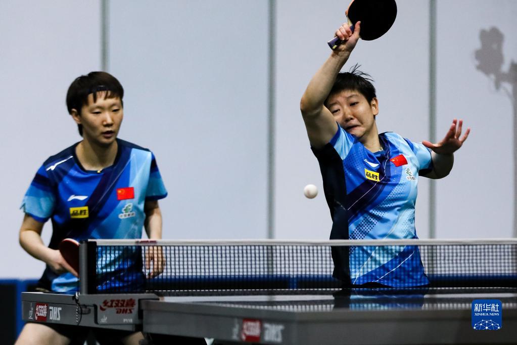 5月22日,孙颖莎/王曼昱(左)在比赛中回球。新华社记者 张誉东 摄