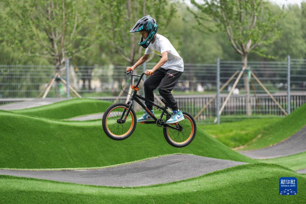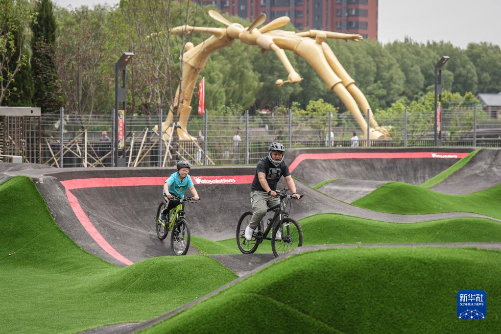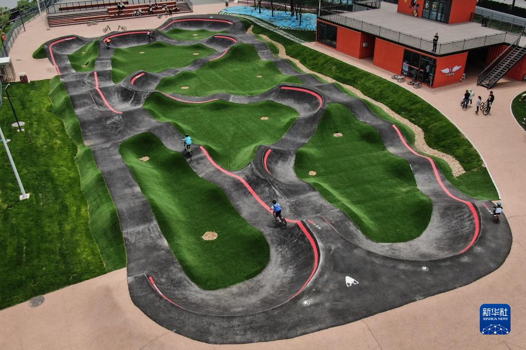5月27日,骑行爱好者在沈阳国际泵道公园内的泵道骑行。新华社记者 潘昱龙 摄