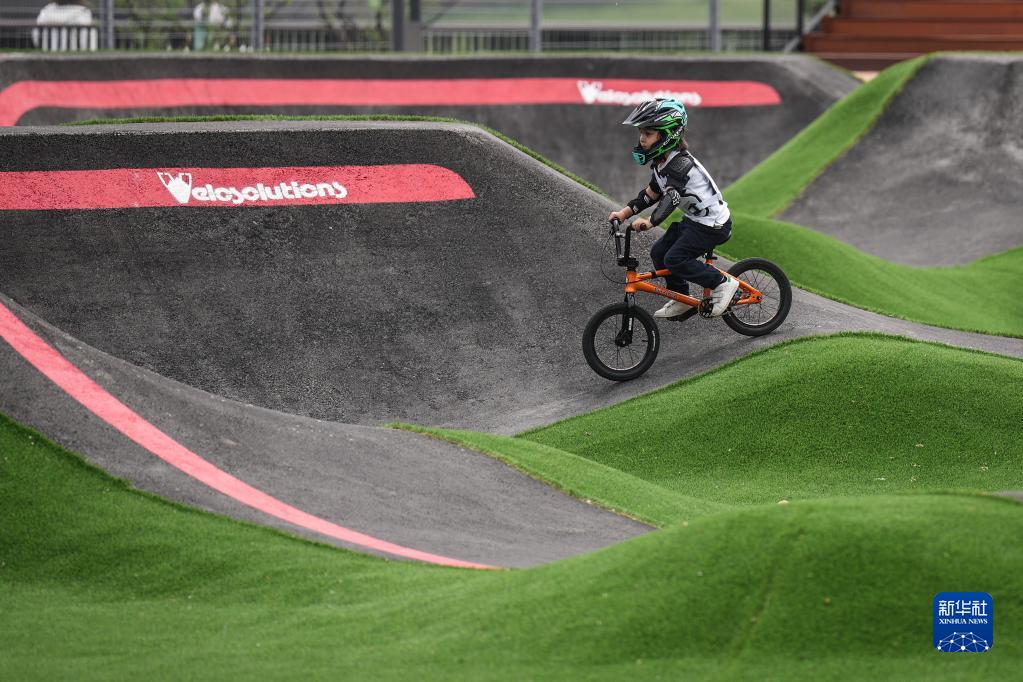 5月27日,一位小朋友在沈阳国际泵道公园内的泵道骑行。新华社记者 潘昱龙 摄
