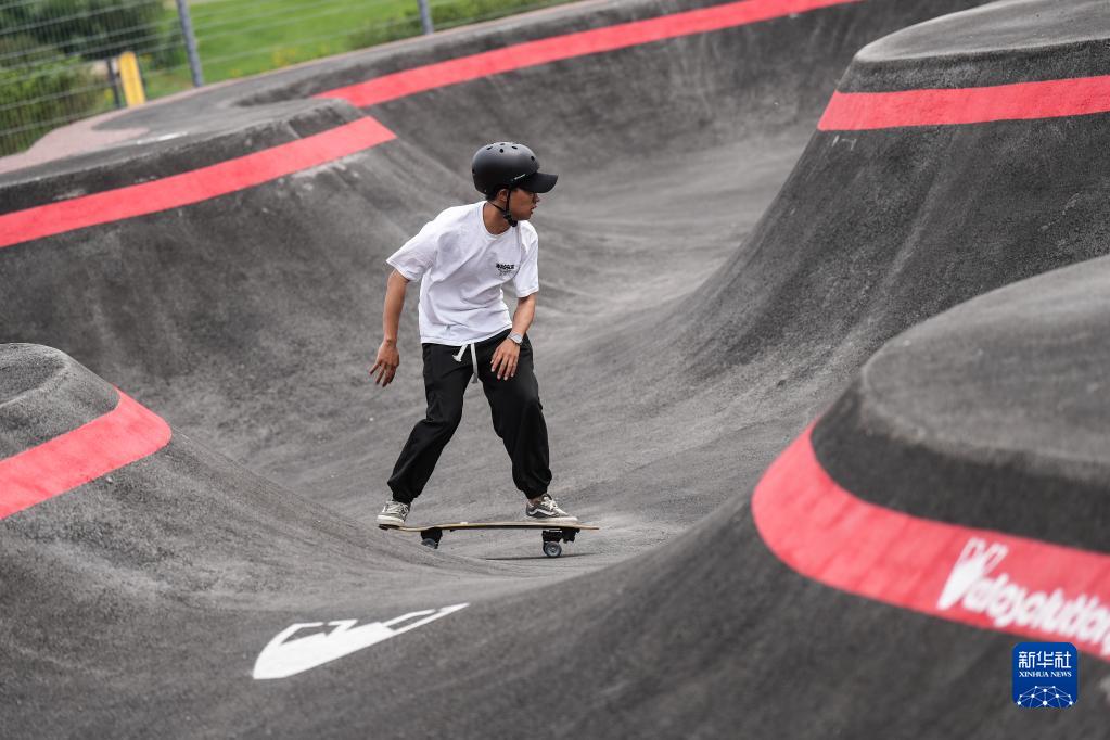 5月27日,一位滑板爱好者在沈阳国际泵道公园内的泵道滑行。新华社记者 潘昱龙 摄
