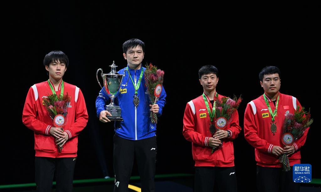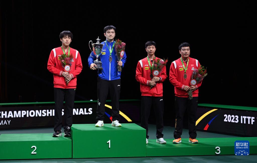 5月28日,冠军樊振东(左二)、亚军王楚钦(左一)和季军马龙(右二)、梁靖崑在颁奖仪式上。新华社记者 陶希夷 摄