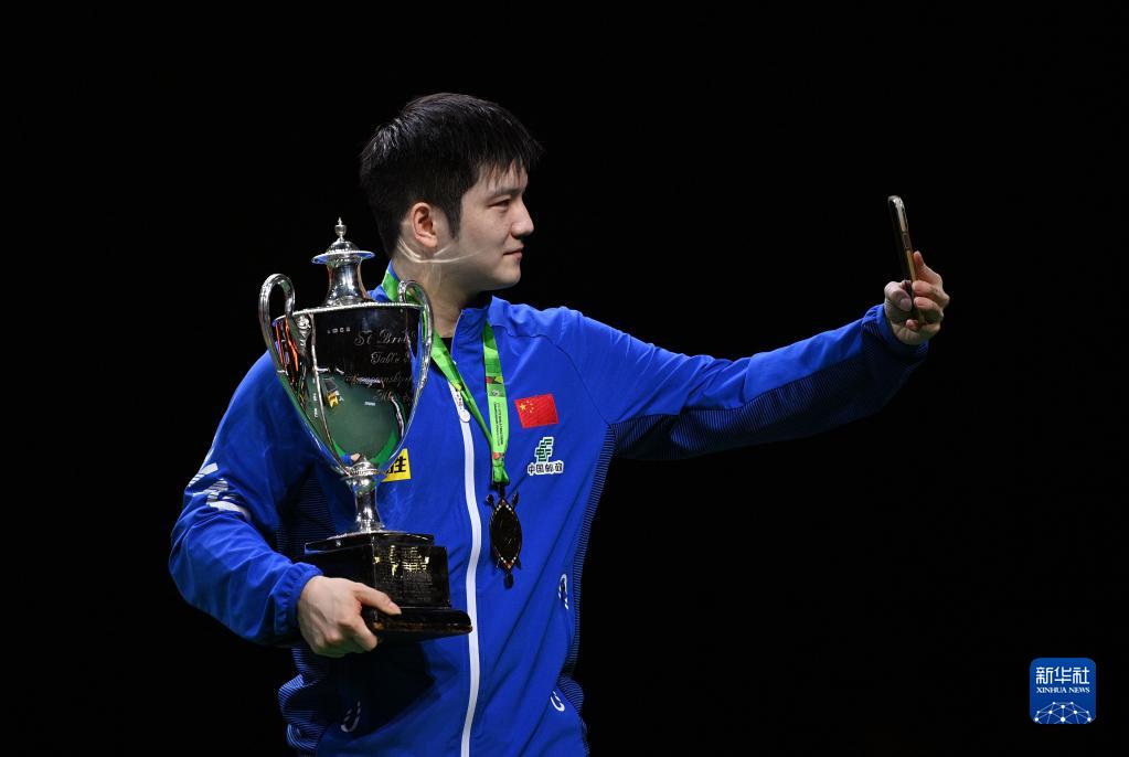 5月28日,樊振东在颁奖仪式上准备自拍留念。新华社记者 陶希夷 摄