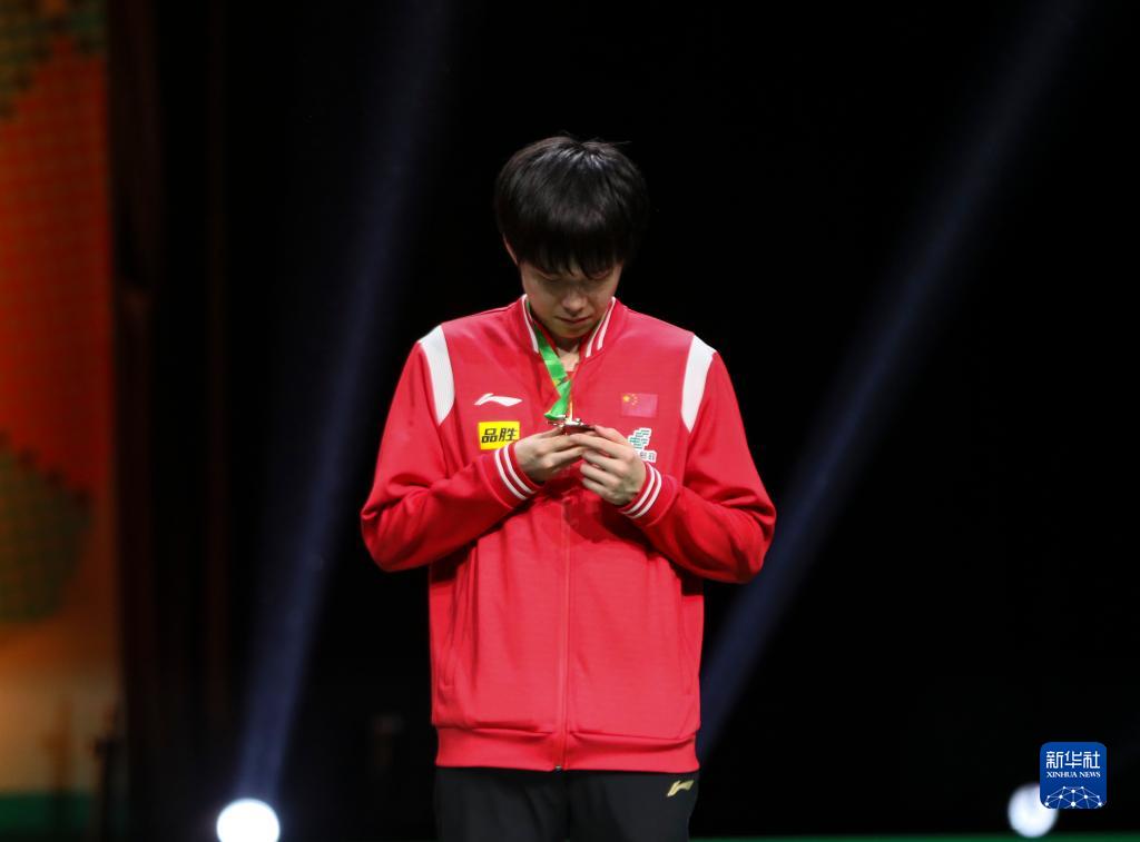 5月28日,王楚钦在颁奖仪式上观察奖牌。新华社记者 张誉东 摄