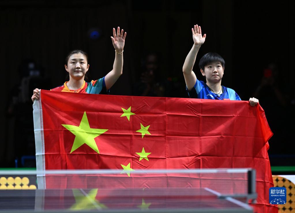 5月28日,陈梦(左)和孙颖莎赛后向观众致意。新华社记者 陶希夷 摄