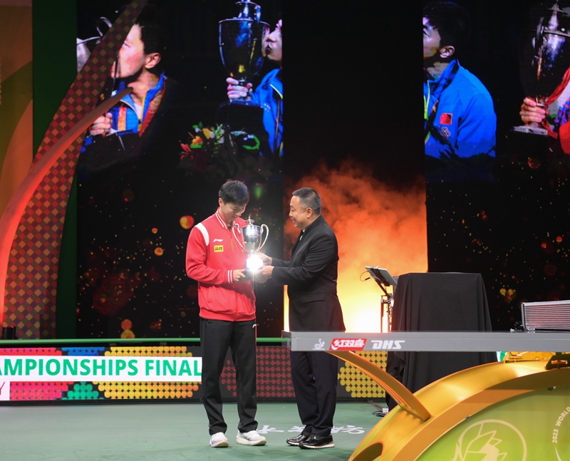 男单决赛开始前,赛场留给了2015年至2019年连续三届世乒赛夺得男单冠军的马龙,这位乒坛“大满贯”得主从国际乒联第一副主席、WTT世界乒联董事会主席、中国乒协主席刘国梁手中接过了象征世乒赛三连冠得主的复刻圣·勃莱德杯。