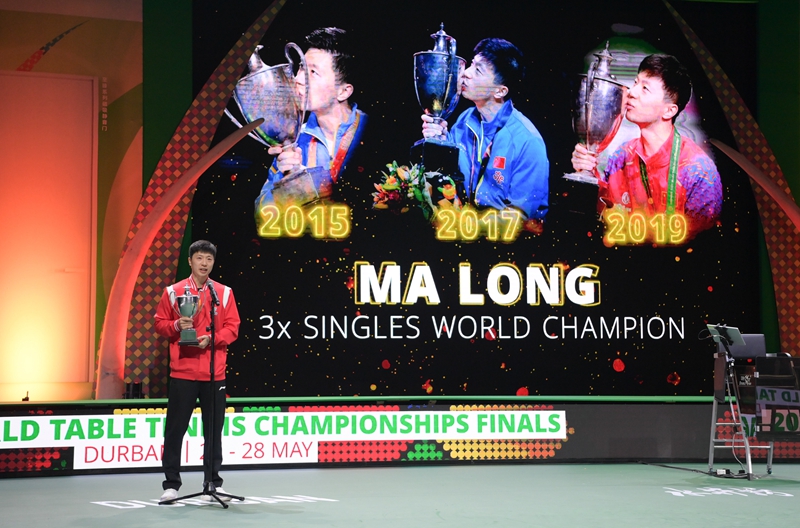 28日,德班世乒赛两场单打决赛之间,国际乒联为曾完成世乒赛男单三连冠的国乒老将马龙颁发了复刻圣·勃莱德杯。对此马龙表示,这是自己最特别的一座奖杯,尚不确定本届世乒赛是否为自己最后一次世乒赛单项赛。