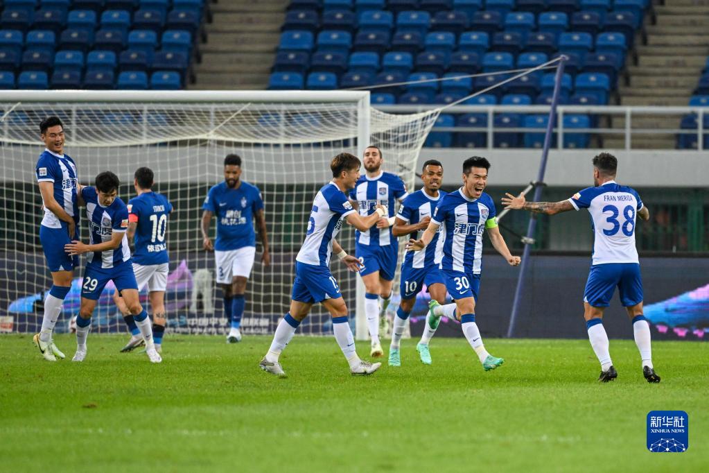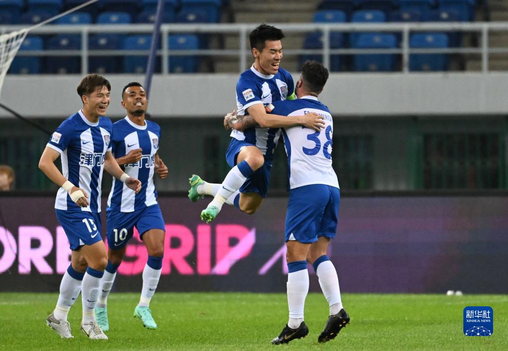 6月4日,天津津门虎队球员王秋明(右二)进球后与队友庆祝。新华社记者 孙凡越 摄
