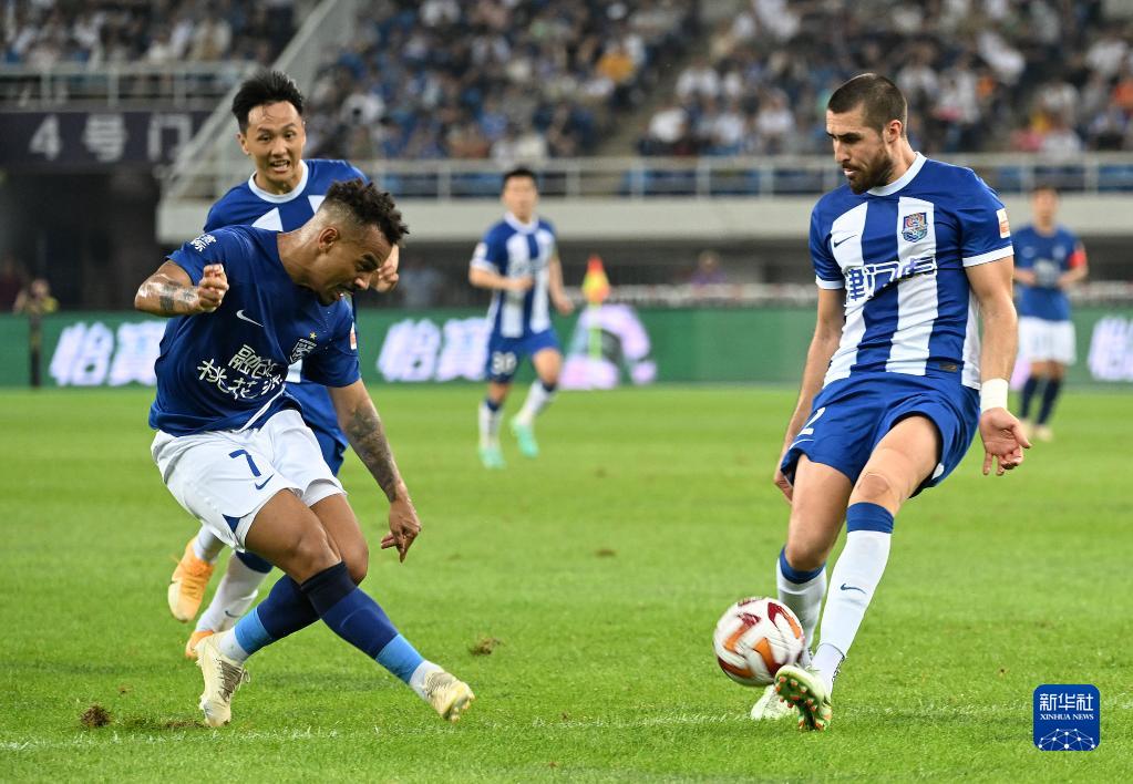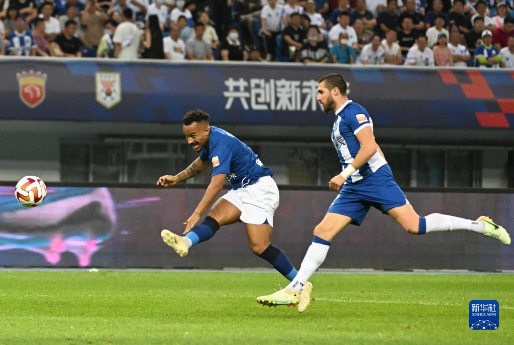 6月4日,武汉三镇队球员埃德米尔森(左)在比赛中射门得分。新华社记者 孙凡越 摄