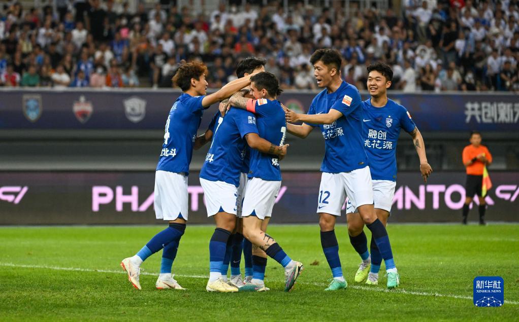 6月4日,武汉三镇队球员庆祝进球。新华社记者 孙凡越 摄