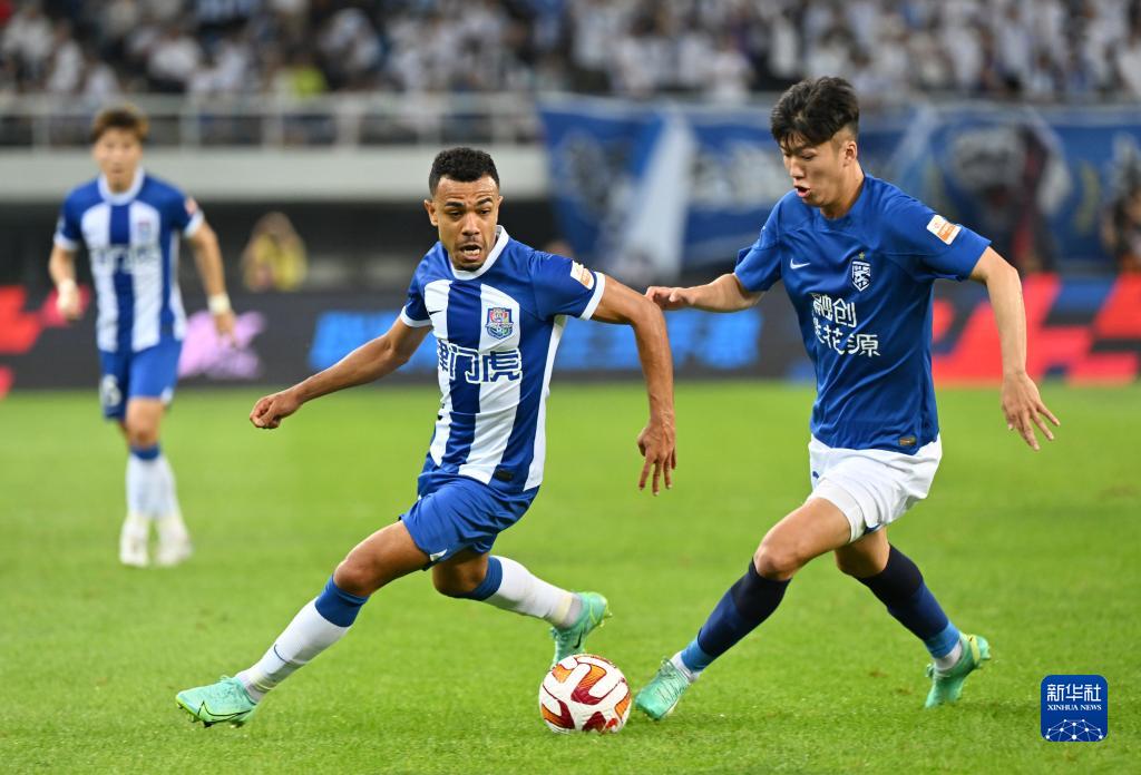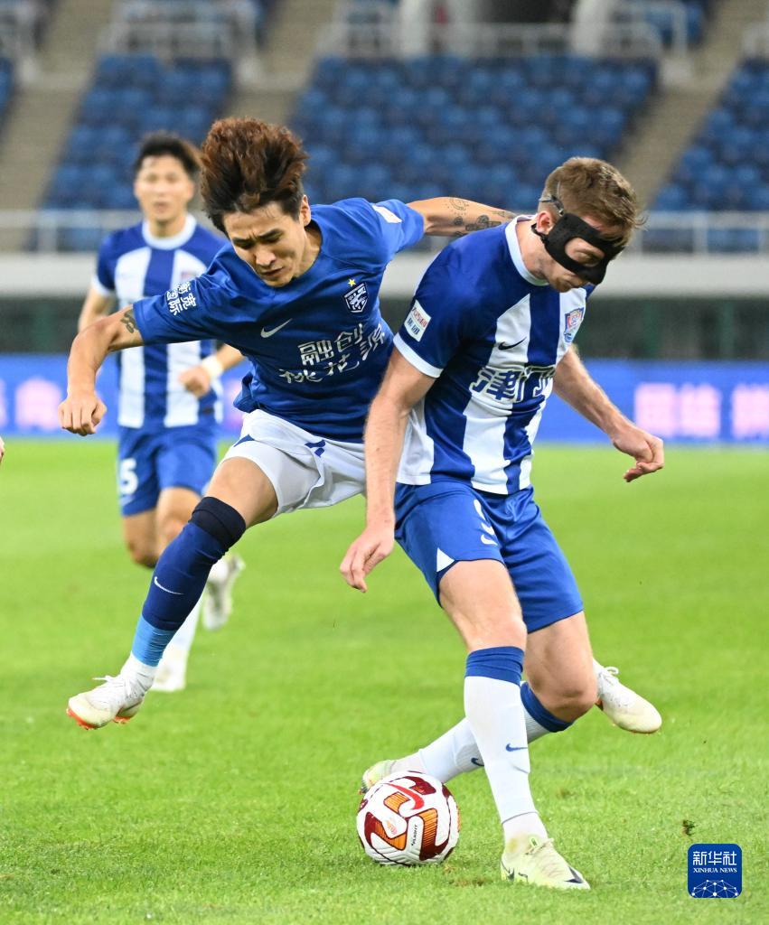6月4日,天津津门虎队球员法利·维埃拉·罗萨(左)与武汉三镇队球员张晓彬在比赛中拼抢。新华社记者 李然 摄