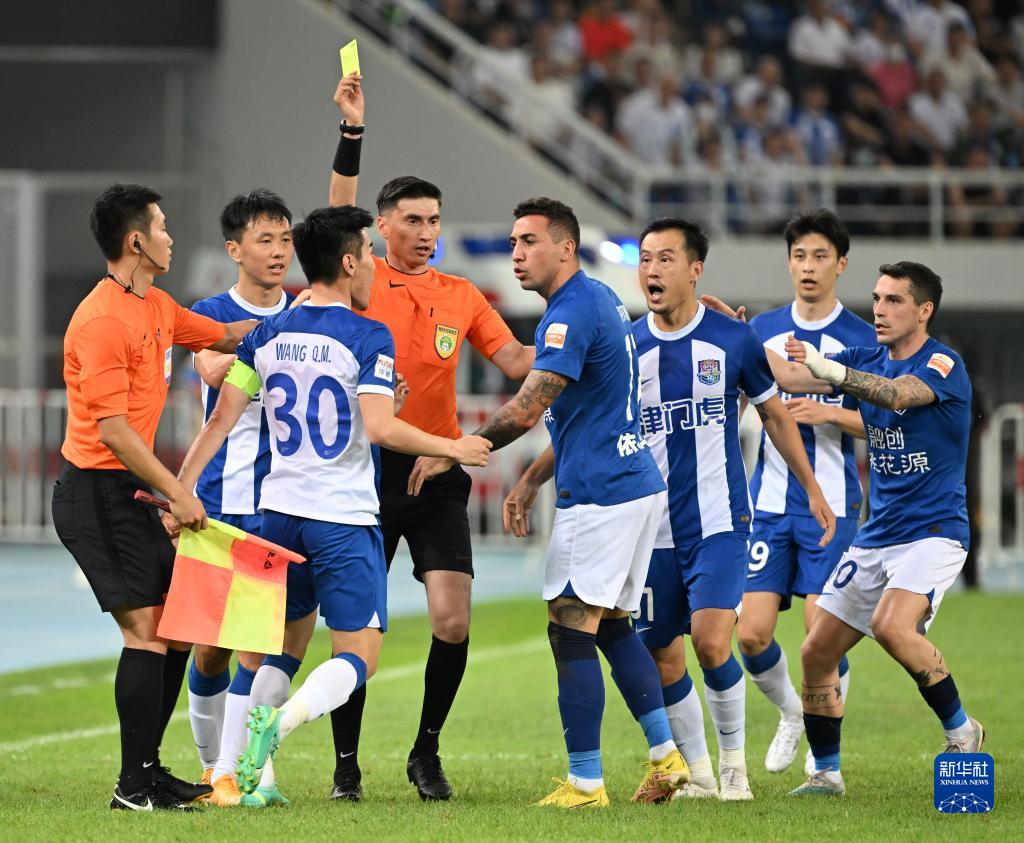 6月4日,主裁判麦麦提江·艾合麦提(左四)在比赛中向天津津门虎队球员常飞亚(左二)出示黄牌。新华社记者 李然 摄