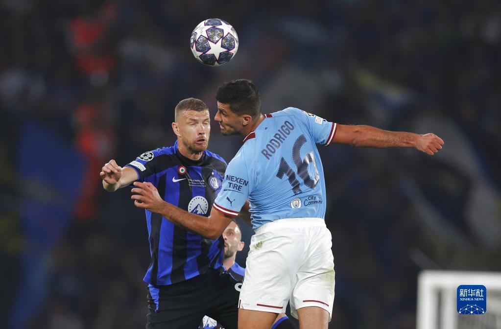 6月10日,国际米兰队球员哲科(左)与曼彻斯特城队球员罗德里·埃尔南德斯在比赛中争顶。新华社发