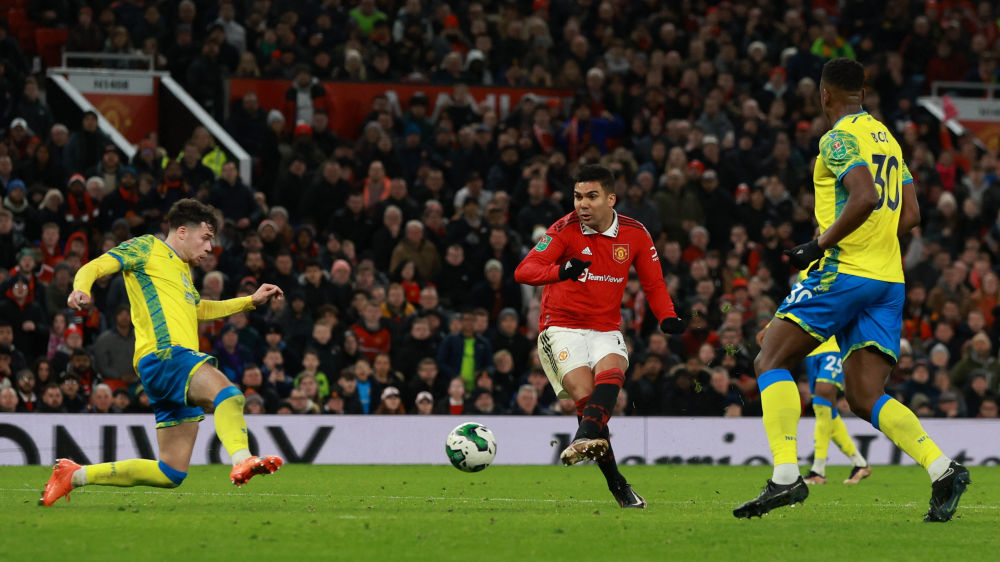 2月1日,曼联队球员卡塞米罗(中)在比赛中射门。新华社/路透