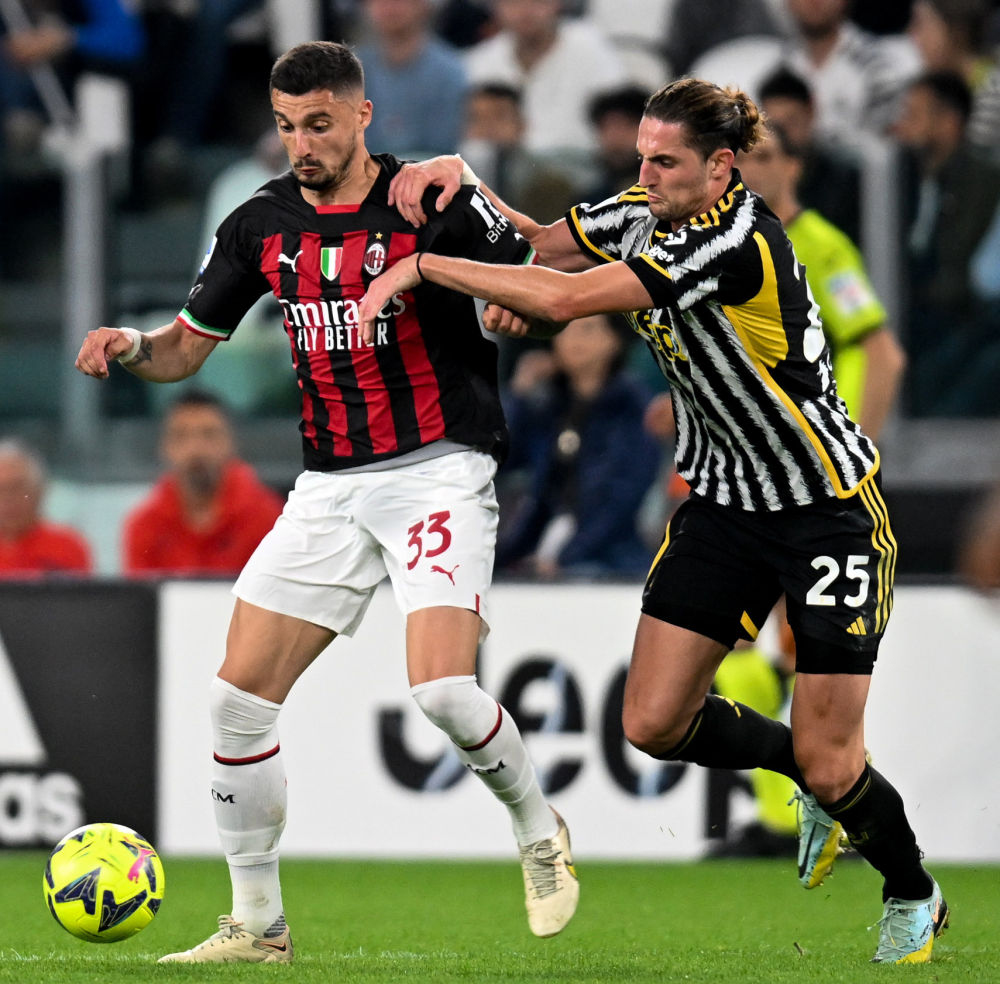 5月28日,尤文图斯队球员拉比奥与AC米兰队球员克鲁尼奇(左)在比赛中拼抢。新华社发(达尼埃莱·马斯科洛摄)