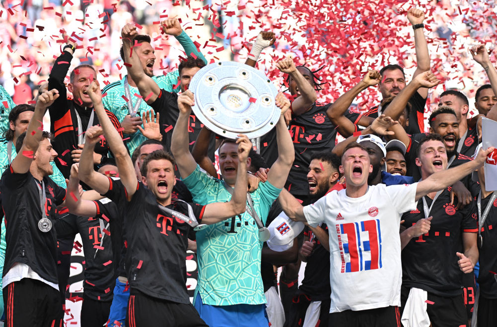 5月27日,拜仁慕尼黑队球员在颁奖仪式上庆祝。新华社/路透