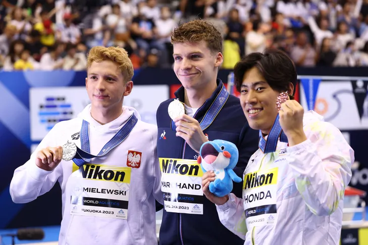 日本选手本多灯(右一)在颁奖仪式上。图片来自世界泳联官网