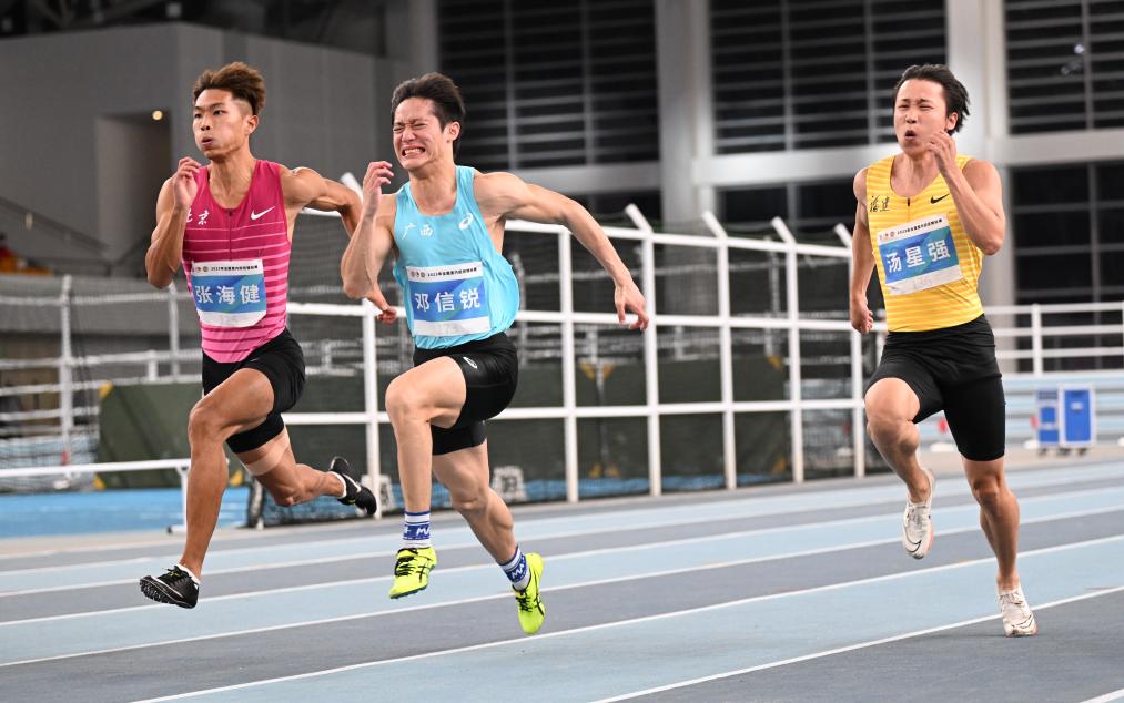 3月16日,北京队选手张海健(左)、广西队选手邓信锐(中)在2023年全国室内田径锦标赛男子60米决赛比赛中。最终,张海健以6秒64的成绩获得亚军,邓信锐以6秒65的成绩获得季军。新华社记者 孙凡越 摄