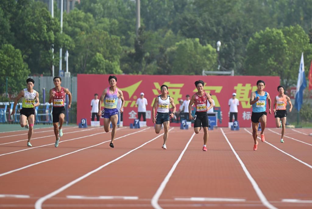8月11日,暨南大学选手严海滨(左二)在第21届全国大学生田径锦标赛男子丁组100米决赛中。新华社记者 周牧 摄