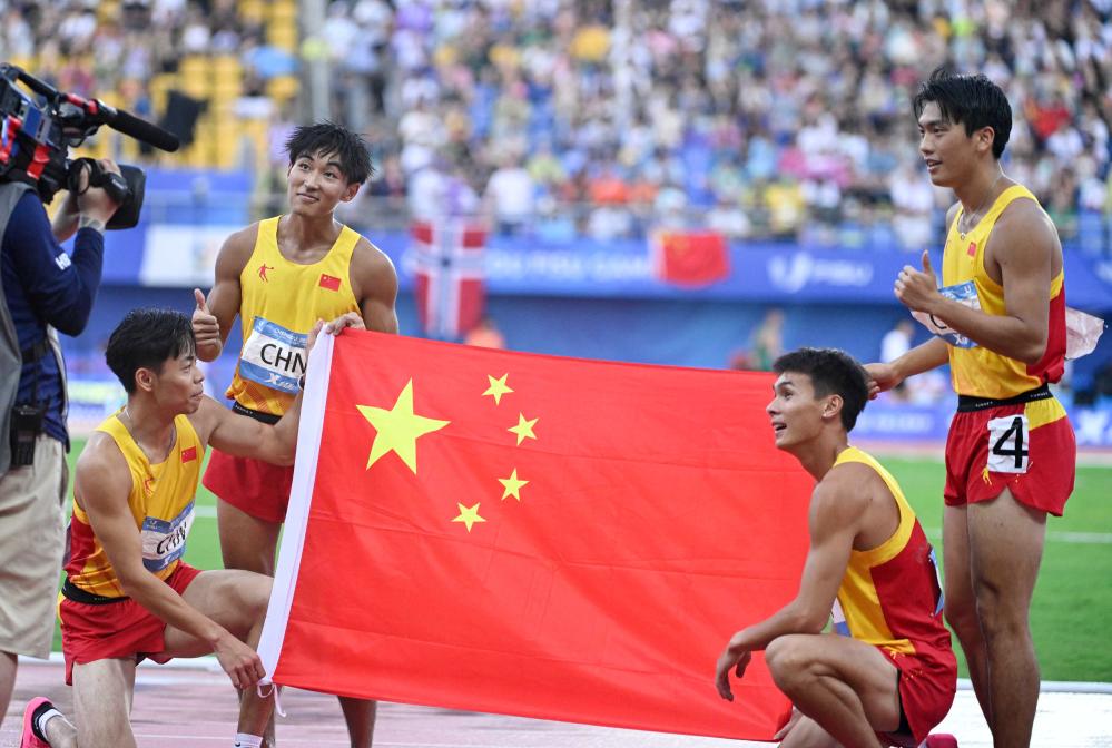 8月6日,中国队选手陈佳鹏(左上)、陈冠锋(左下)、邓智舰(右上)、严海滨(右下)在成都大运会田径男子4x100米接力决赛后庆祝。新华社记者 邓华 摄