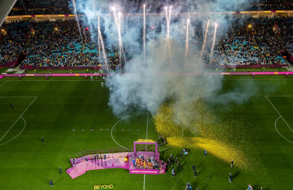 新华社广州8月21日电(记者王浩明、树文、韦骅)20日晚,澳大利亚体育场,烟花盛放。西班牙队高高举起冠军奖杯,新王加冕。