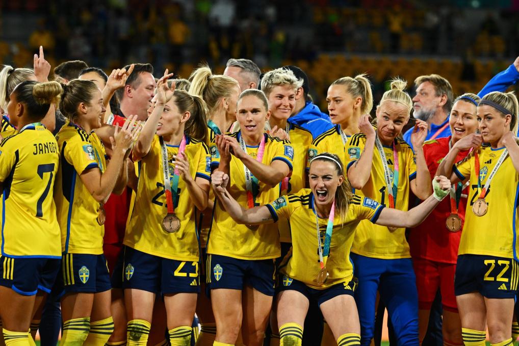 8月19日,瑞典队球员在季军颁奖仪式上庆祝。新华社记者李一博摄