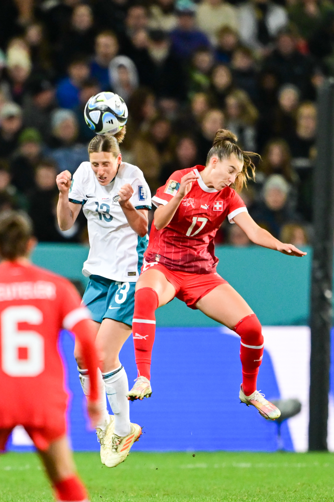 7月30日,新西兰队球员斯托特(左)与瑞士队球员皮乌贝尔在比赛中争顶。新华社记者朱炜摄