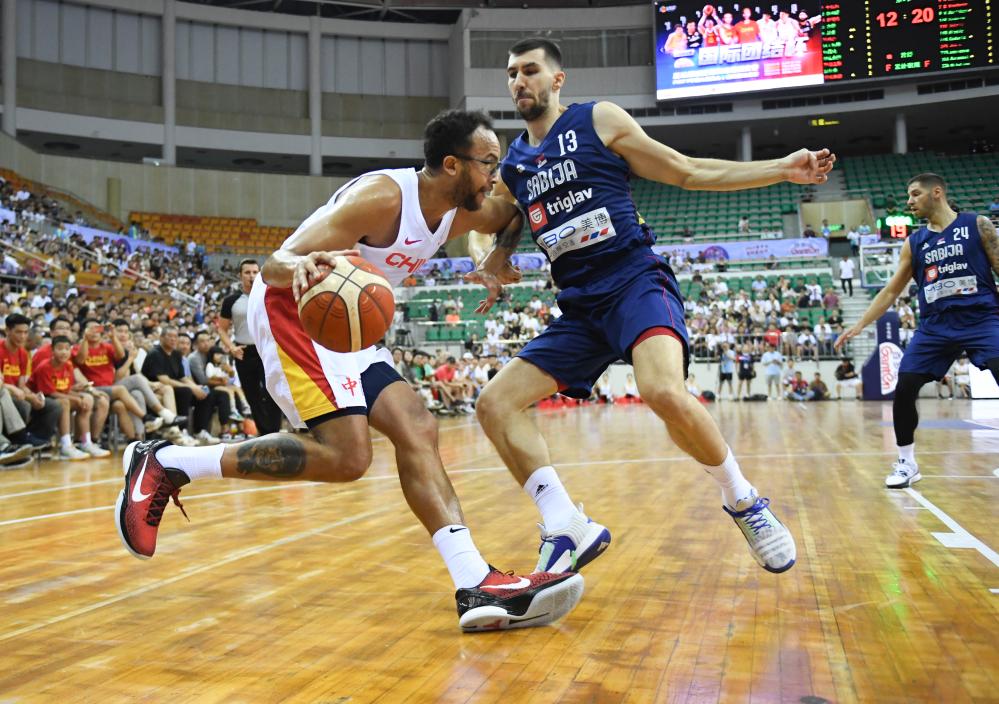 8月20日,在深圳举办的中国队对战塞尔维亚队的国际团结杯篮球赛中,中国队球员李凯尔(左)的突破瞬间。新华社记者 毛思倩 摄
