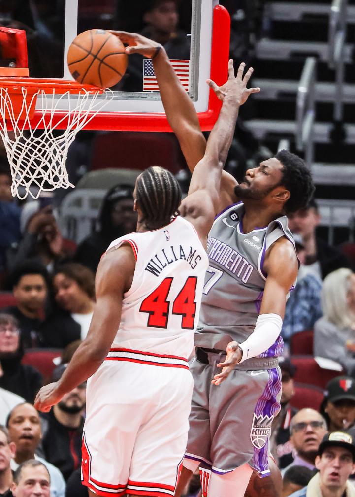 3月15日,效力于萨克拉门托国王队的爱德华兹(右)在比赛中扣篮。当日,在2022-2023赛季NBA常规赛中,萨克拉门托国王队客场以117:114战胜芝加哥公牛队。新华社发(乔尔·莱纳摄)