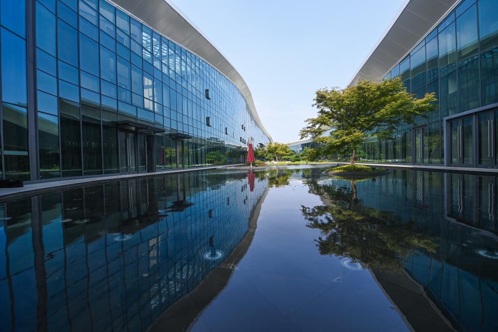 在场馆顶楼,一座美丽又具科技感的“空中花园”静静伫立,不仅让整个场馆的绿化率达到45%,还为城市环境贡献了固碳释氧、隔热保温、减轻雨水径流三大功能;花园旁的鹅卵石小径还隐藏着雨水循环系统的地下“毛细血管”,江南丰富的雨水资源通过一系列过滤后再利用,用作场馆中庭、水系及喷泉、灌溉用水等,场馆预计每月能节约1000吨水。