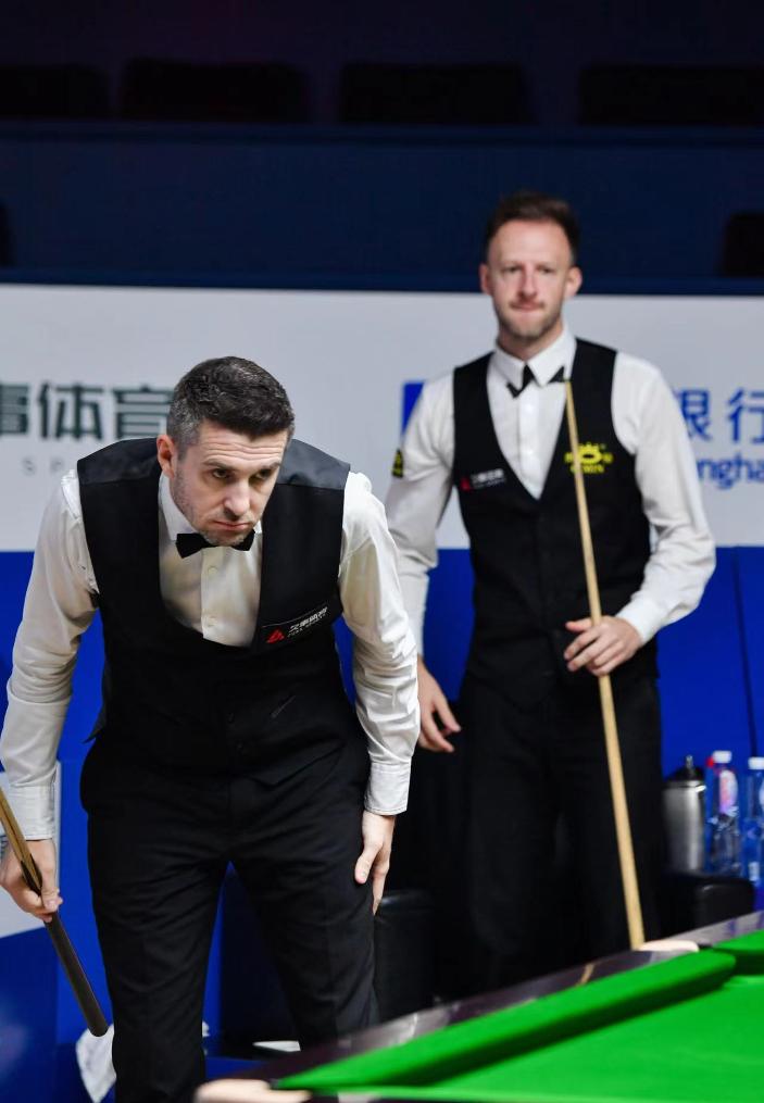 塞尔比(左)与特鲁姆普在比赛中。图片来自斯诺克上海大师赛官方社交账号