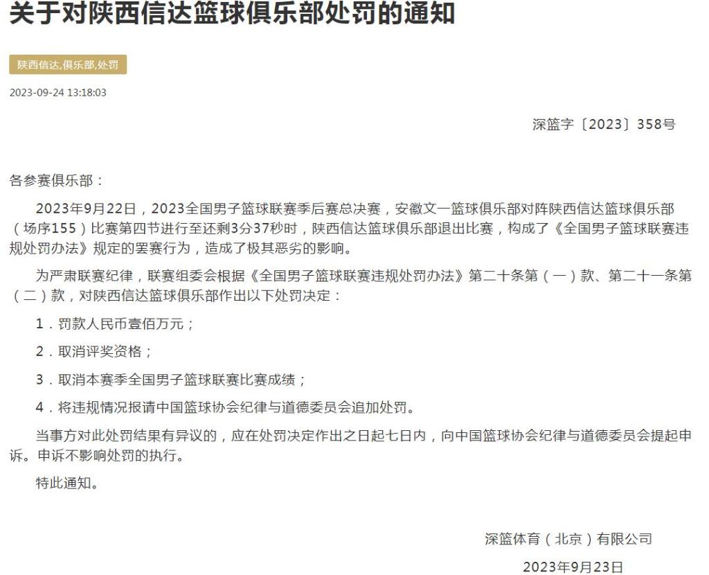 随后,中国篮球协会官网发布了《关于对陕西信达篮球俱乐部处罚的通知》,通知显示,NBL联赛组委会对陕西信达篮球俱乐部罚款人民币100万元、取消评奖资格、取消本赛季全国男子篮球联赛比赛成绩,将违规情况报请中国篮球协会纪律与道德委员会追加处罚。
