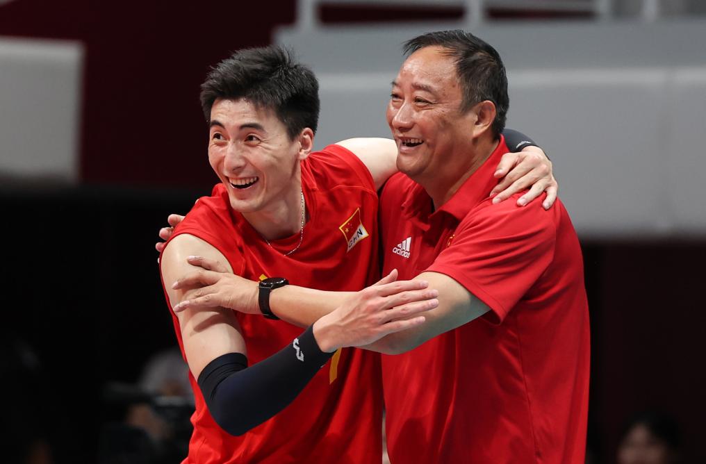 9月25日,杭州亚运会男子排球半决赛,中国队球员于垚辰(左)在比赛中和主教练吴胜庆祝得分。新华社记者朱峥摄