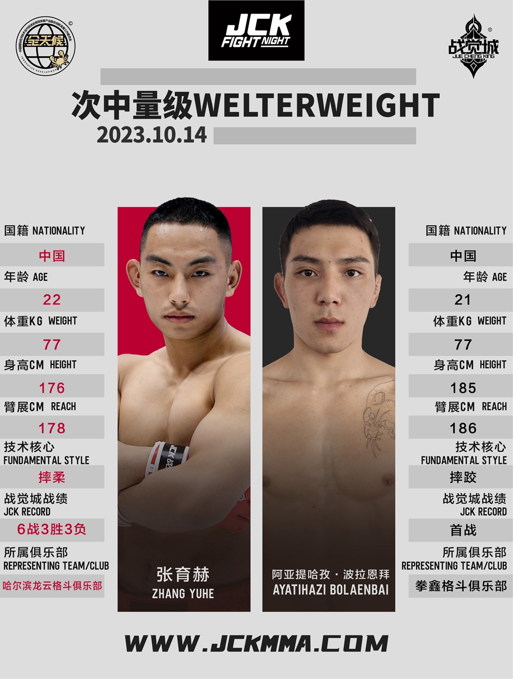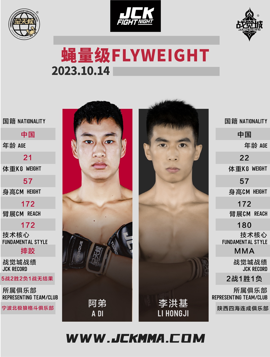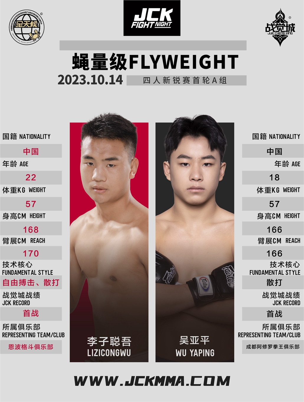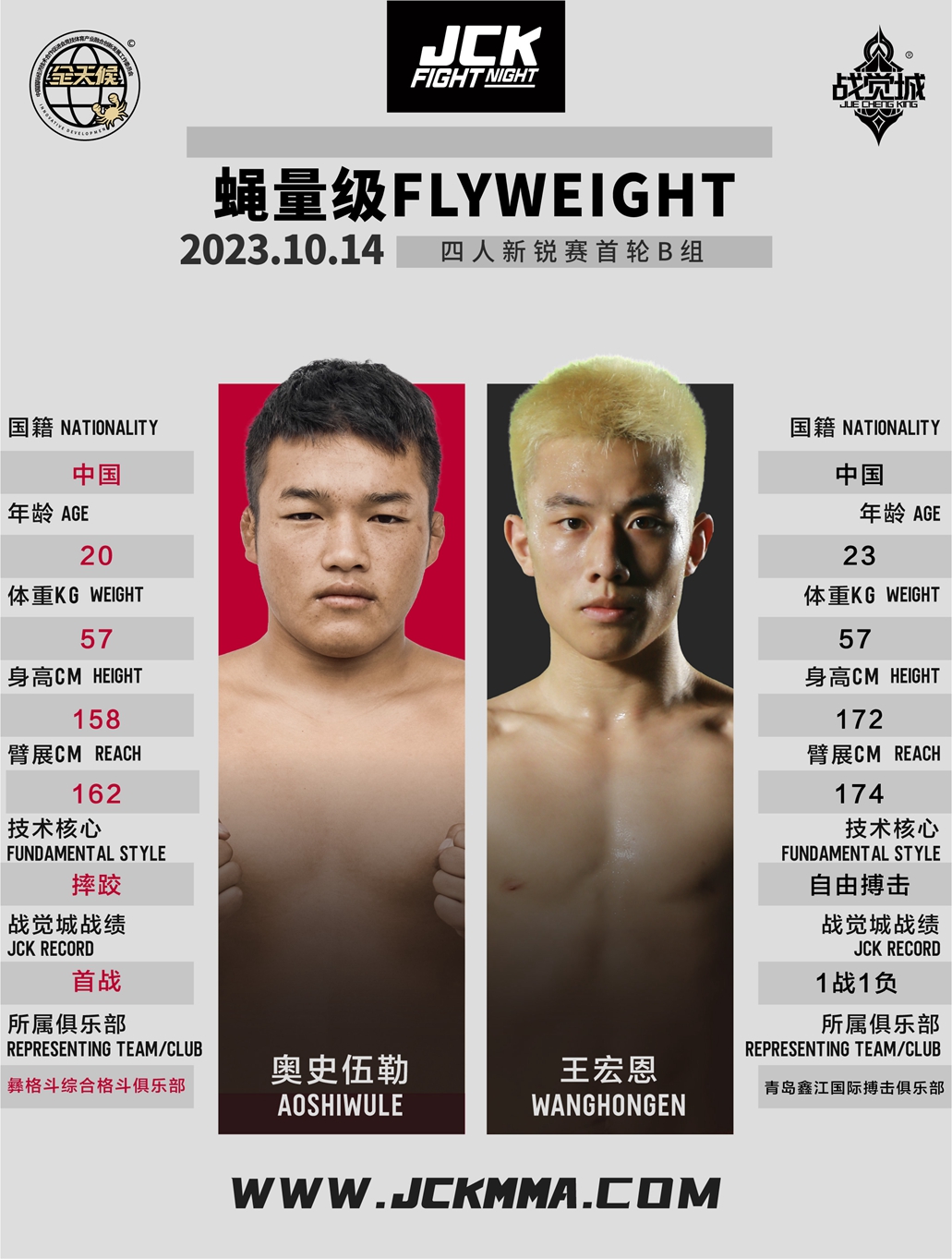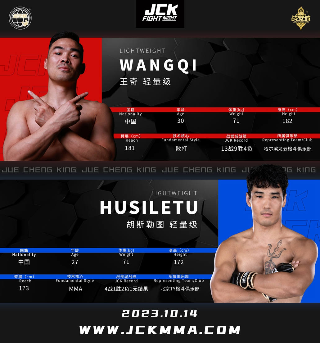 2023年10月14日,JCK觉城之夜N71“骄兵悍将”即将打响,头条主赛散打名将王奇与地面高手胡斯勒图针锋相对,联合主赛两位超强“战士”杨飞与谢超上演“地面大戏”,主赛部分阿弟与李洪基一争高下;四人新锐赛首轮阵容李子聪吾VS吴亚平、奥史伍勒VS王宏恩,两场比赛获胜方争夺最终冠军,获得JCK战觉城签约合同。