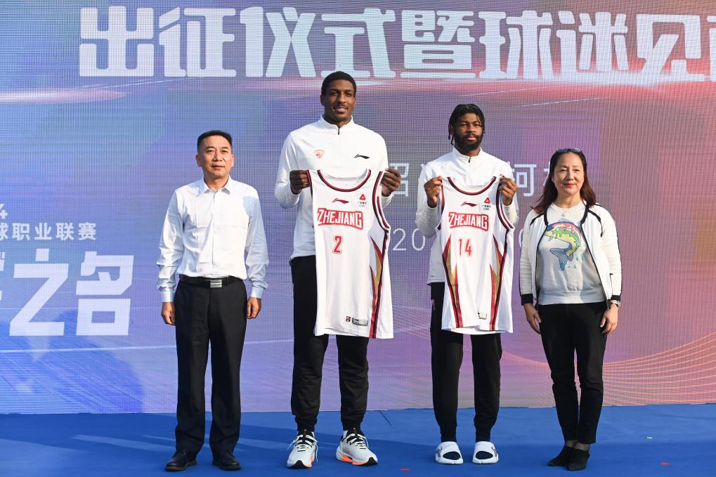 10月17日,浙江稠州队新加盟外援佩里(左二)、纽曼(右二)在新赛季出征仪式暨球迷见面会上亮相。新华社记者 黄宗治 摄