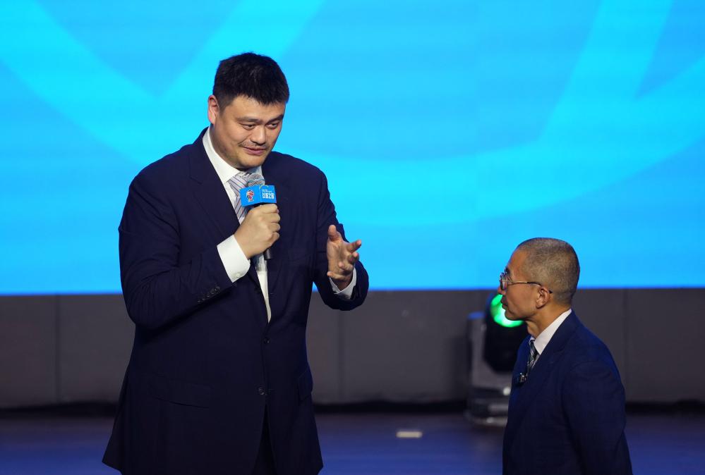 10月12日,中国篮协主席姚明在发布会上回答主持人提问。新华社记者 孟永民 摄