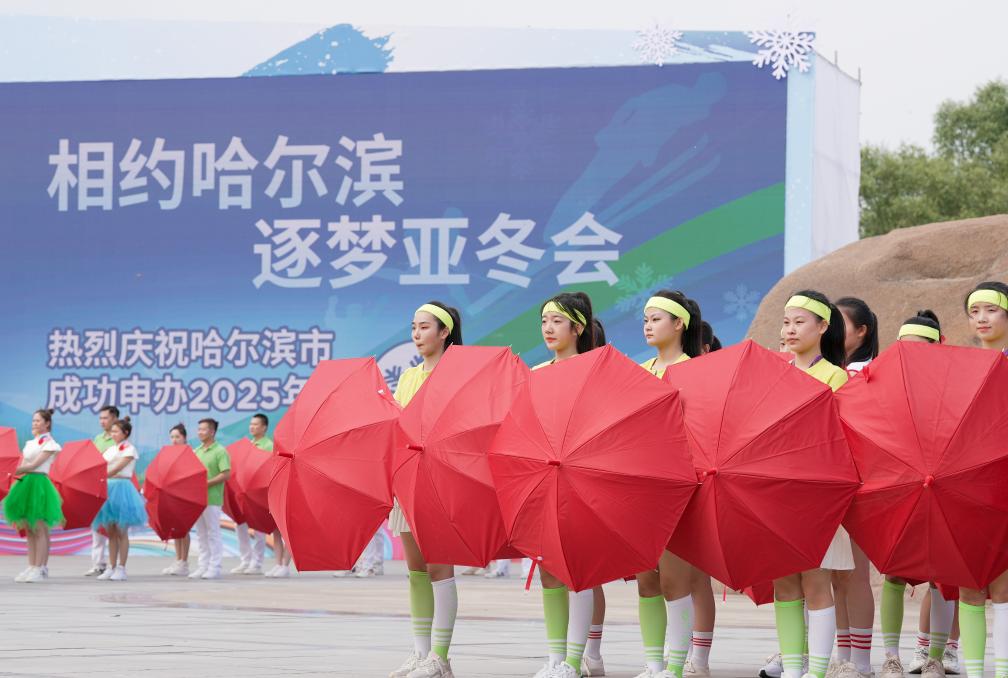 7月8日,在哈尔滨市太阳岛景区太阳石广场,演职人员在庆祝仪式上表演。当日,在泰国曼谷,亚奥理事会在第42届亚奥理事会全体大会上宣布,中国哈尔滨市获得2025年第九届亚洲冬季运动会举办权。新华社记者 王大禹 摄