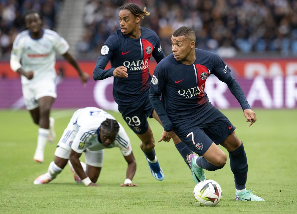 10月21日,巴黎圣日尔曼队球员姆巴佩(右一)在法甲比赛中带球突破。新华社发(杰克·陈摄)