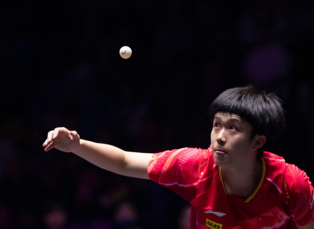 11月3日,王楚钦在比赛中发球。新华社记者 张帆 摄