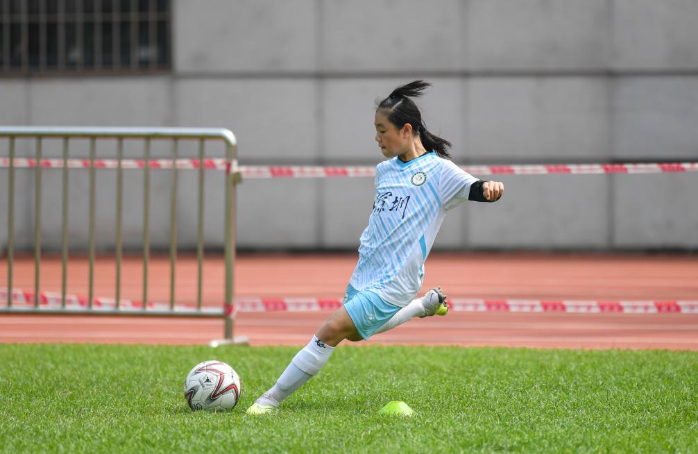2023年4月15日,练昱彤在深圳宝安体育场练习射门。新华社记者 毛思倩 摄