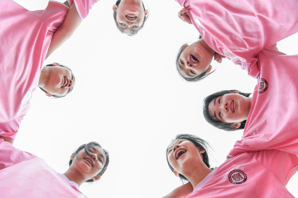 5月11日,练昱彤(左上)在深圳市红岭中学石厦初中部参加校队训练赛时与队友互相加油鼓劲。新华社记者 毛思倩 摄