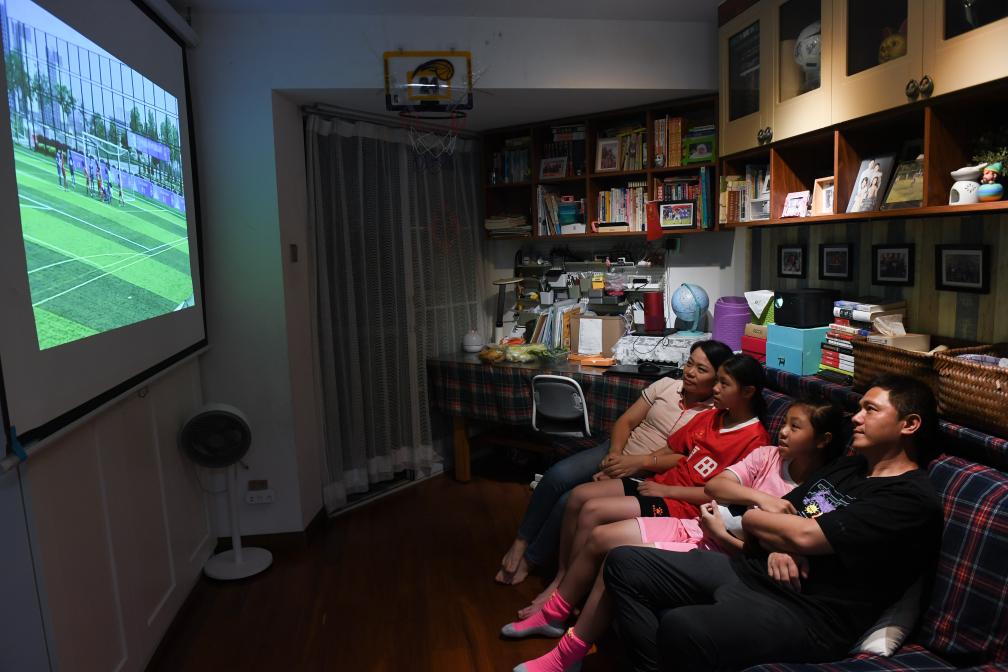 5月11日,练昱彤(右二)和爸爸妈妈以及妹妹在深圳的家中一起回看比赛视频。新华社记者 毛思倩 摄